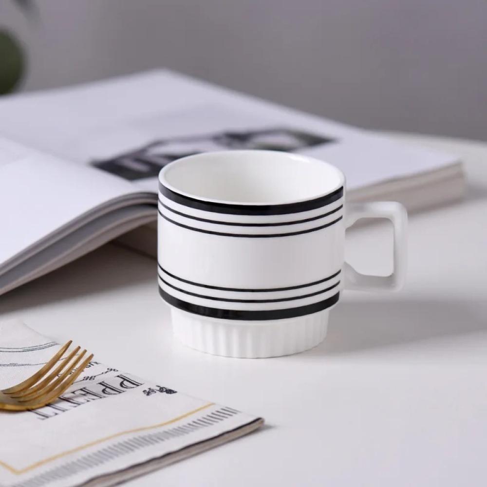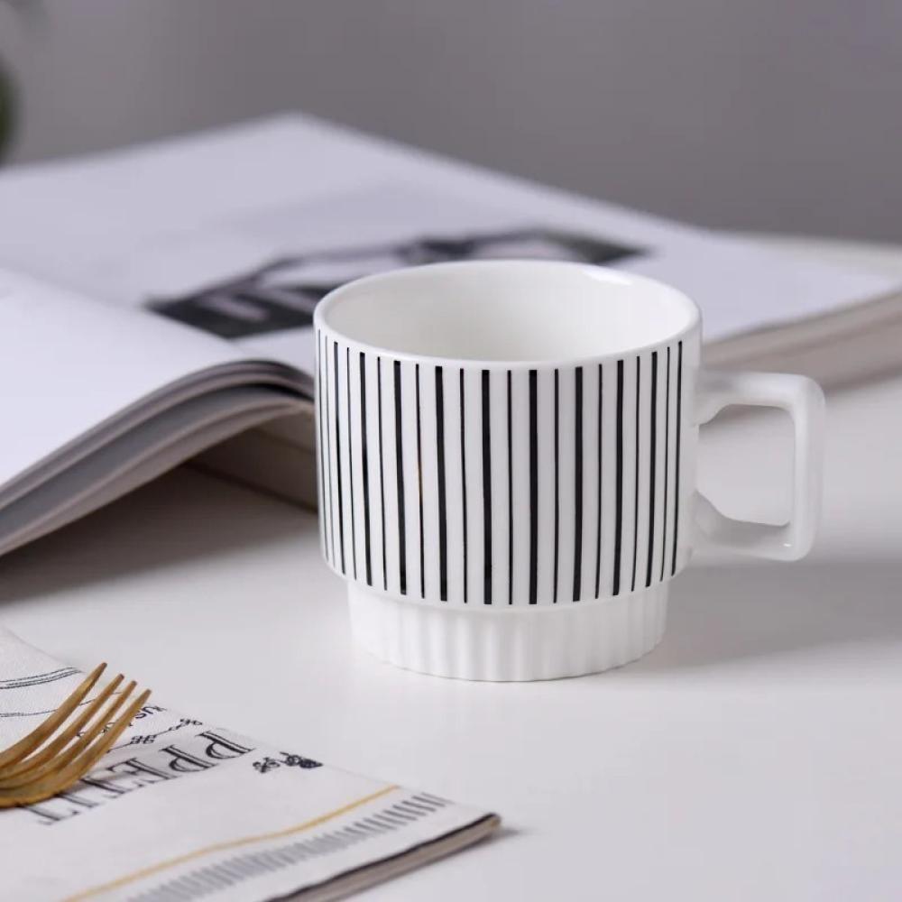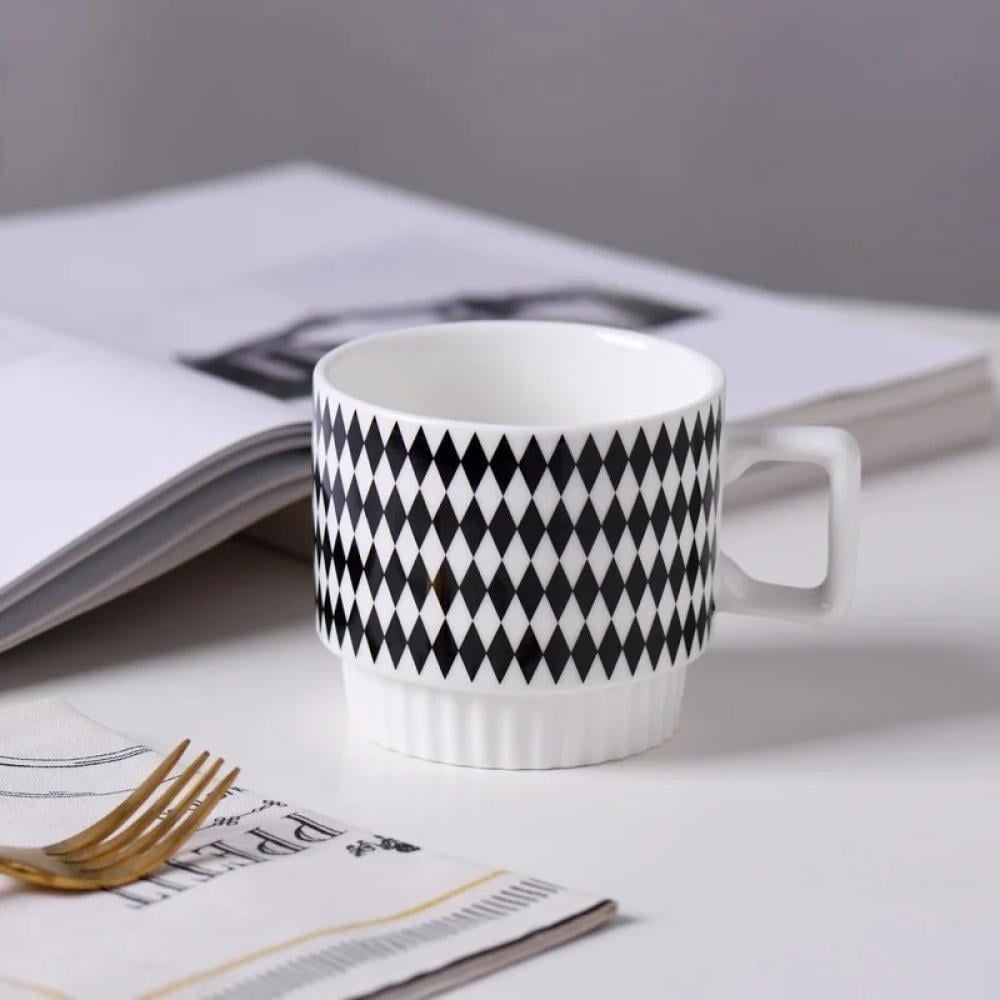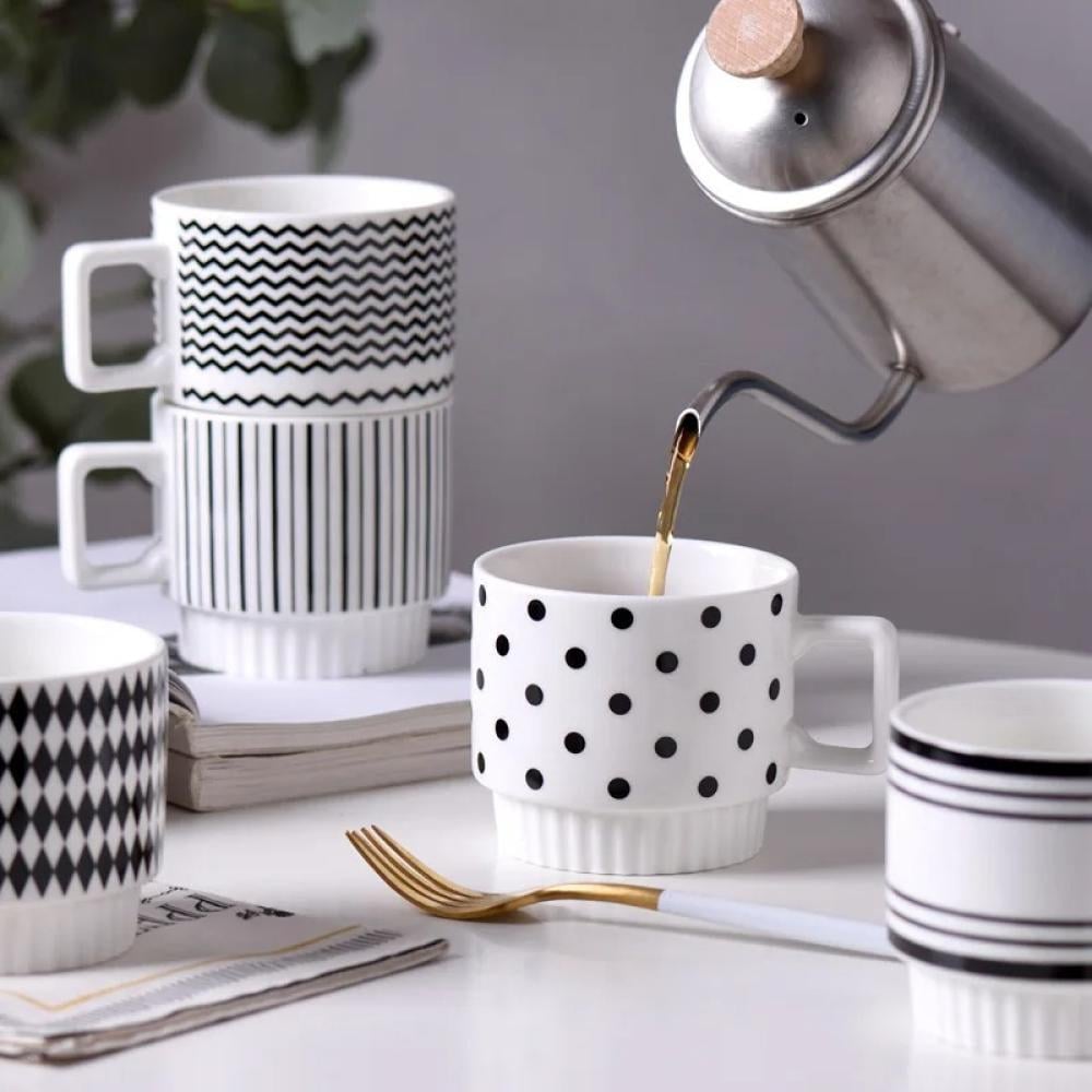 تألّق مع هذه الأكواب السيراميكية المستوحاة من الطراز الإسكندنافي، التي تجمع بين النقاء الكلاسيكي باللونين الأبيض والأسود وتصميمات هندسية أنيقة.
