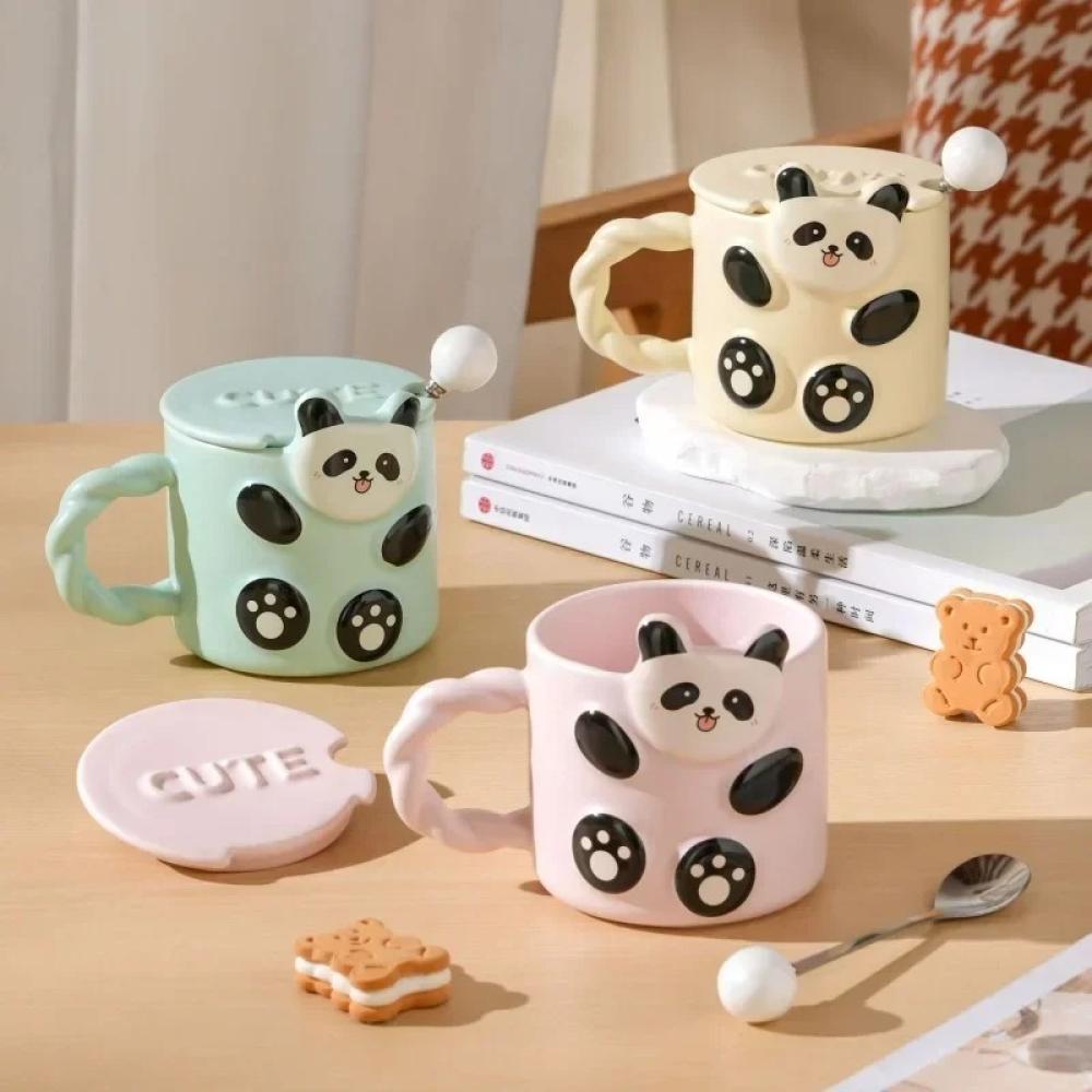 كوب سيراميك بتصميم باندا لطيف مع غطاء وملعقة